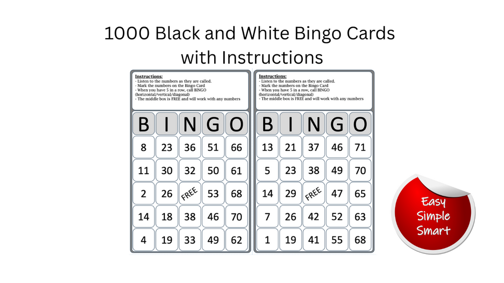 1000 Black and White Bingo Cards with Instructions (Digital Download)