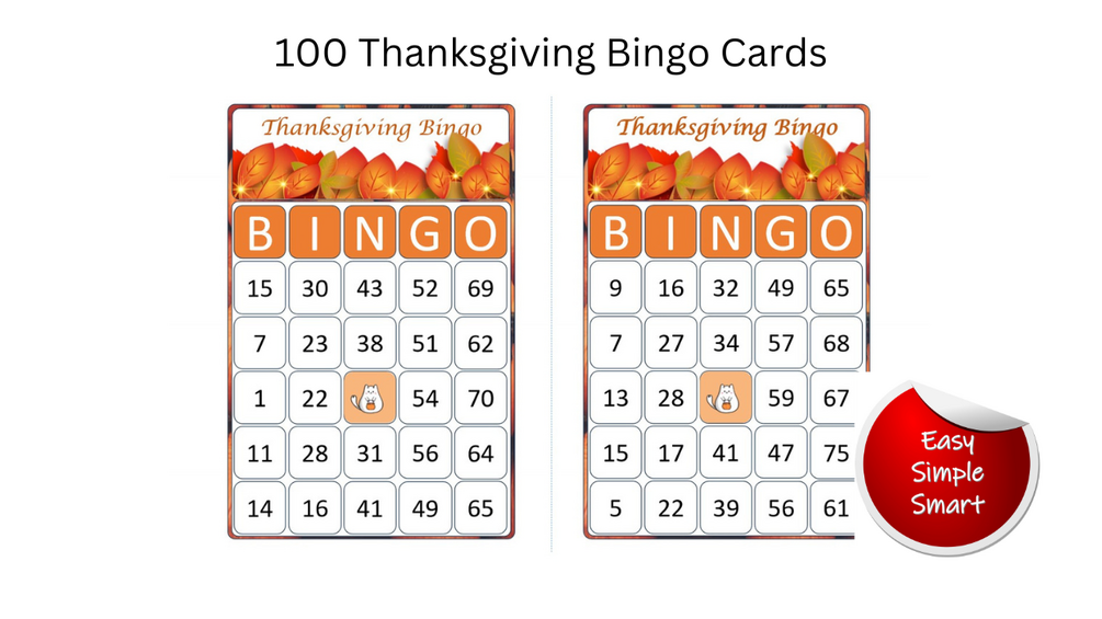 - 100 unique Thanksgiving-themed BINGO cards (2 per page)