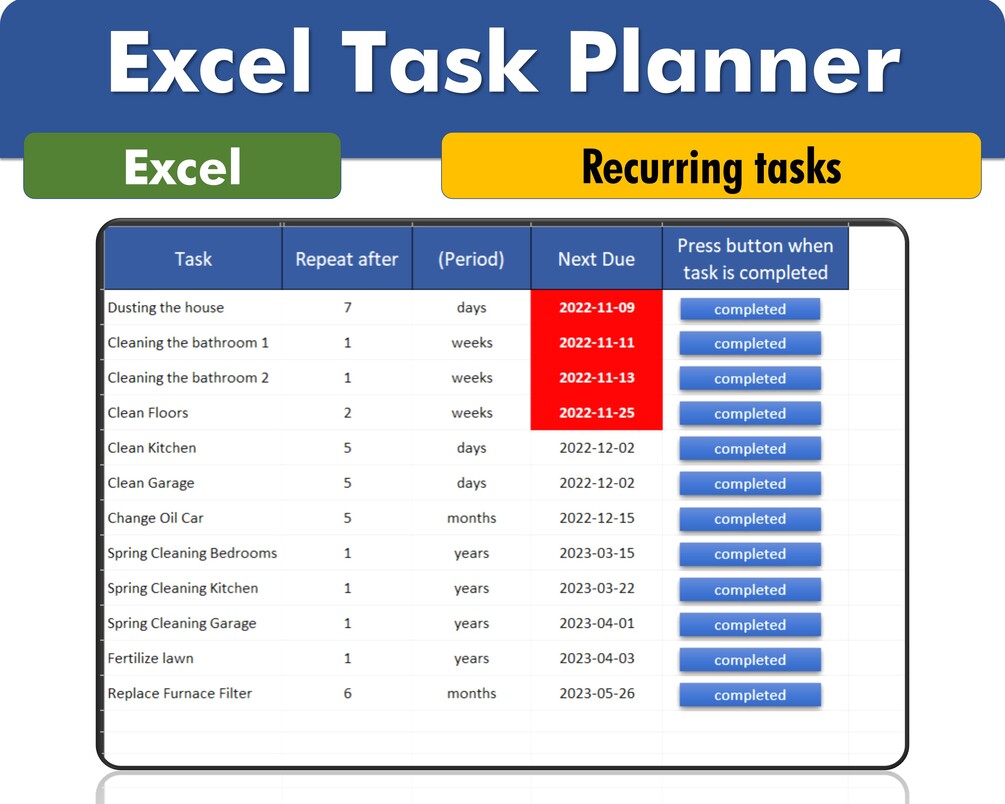 Keep track of all your recurring tasks and house chores, car maintenance, and house maintenance tasks in this handy task planner in Excel 2016 and above.